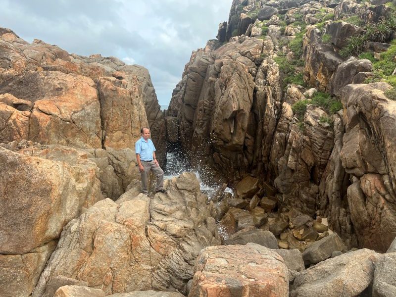 Cạnh Gành Đèn, có hang động nhỏ, nước biển chui vô, tung bọt trắng xóa, khung cảnh hoang sơ